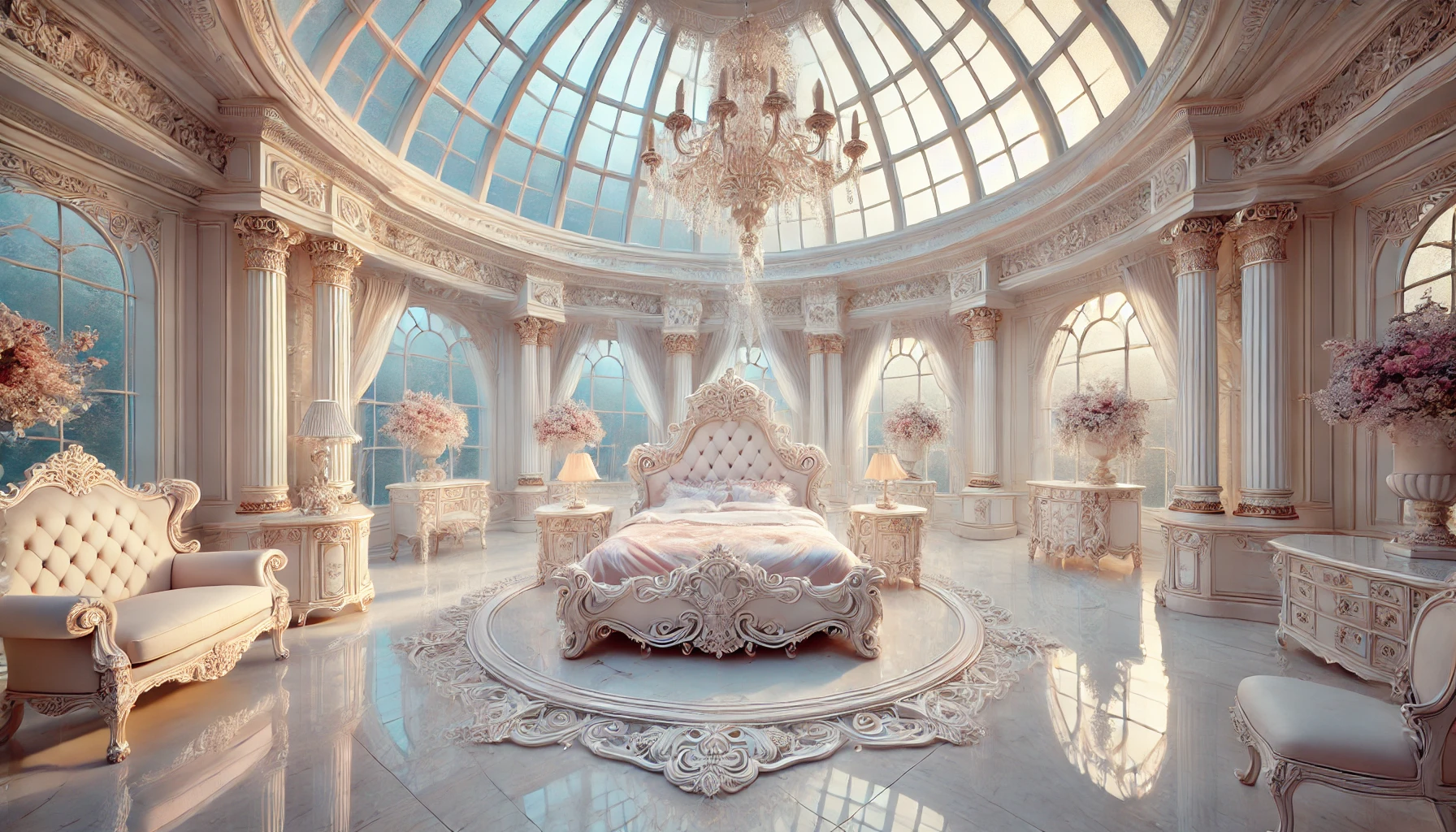 Die königlichen Gemächer sind eine großzügige Suit in der Herrscherkuppel, einem der zahlreichen Türme, um die zentrale Kuppel, die vom Baum überdacht wird. Die Fenster sind riesig, luftig und die Einrichtung ist filigran und ist in Weiß, zartem Pastelrosa sowie Weißgold gehalten. Bild
